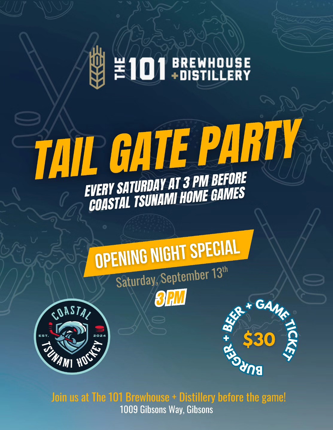 Join us at The 101 Brewhouse + Distillery to celebrate the opening night of Coastal Tsunami Hockey home games!