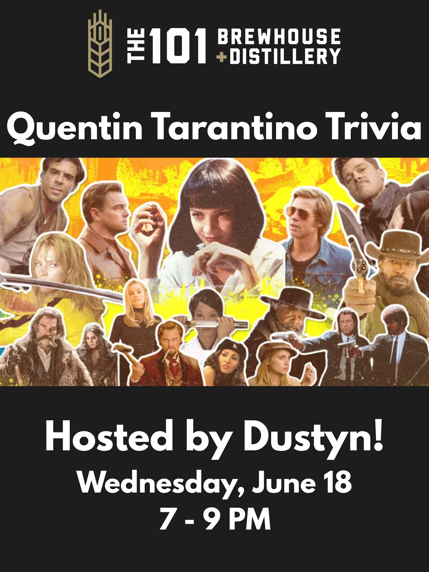 We are very excited to welcome Dustyn back as a our special guest host! Join us for a night of Tarantino-themed trivia where the questions are sharp, the drinks are cold, and the prizes are killer.