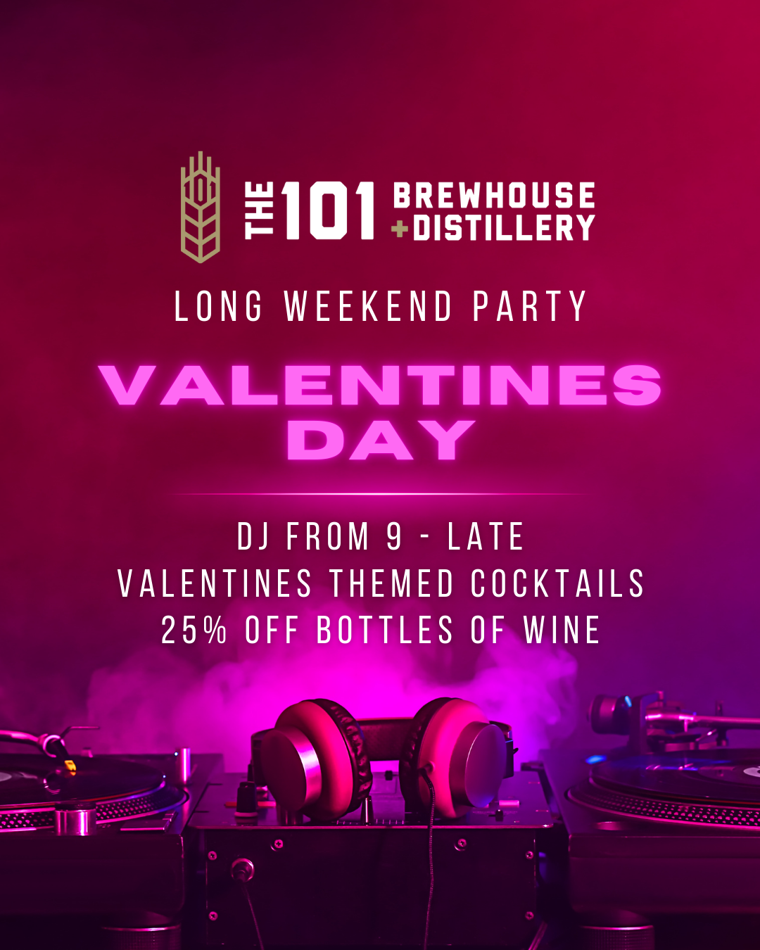 Turn up the romance—and the volume—this Valentine’s weekend at The 101 Brewhouse + Distillery. Whether you’re bringing a date, rolling in with friends, or flying solo, we’re setting the mood for a high-energy night filled with great drinks, great music, and an unforgettable late-night vibe.
