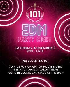 π EDM PARTY NIGHT at The 101 Brewhouse + Distillery! Get ready to light up the dance floor! π₯Join us Saturday, November 8 from 9PM β LATE for a night packed with house music, festival bangers, and non-stop party vibes. π₯ NO COVER β NO DJ β JUST GOOD VIBES! π₯Weβre turning up the volume...